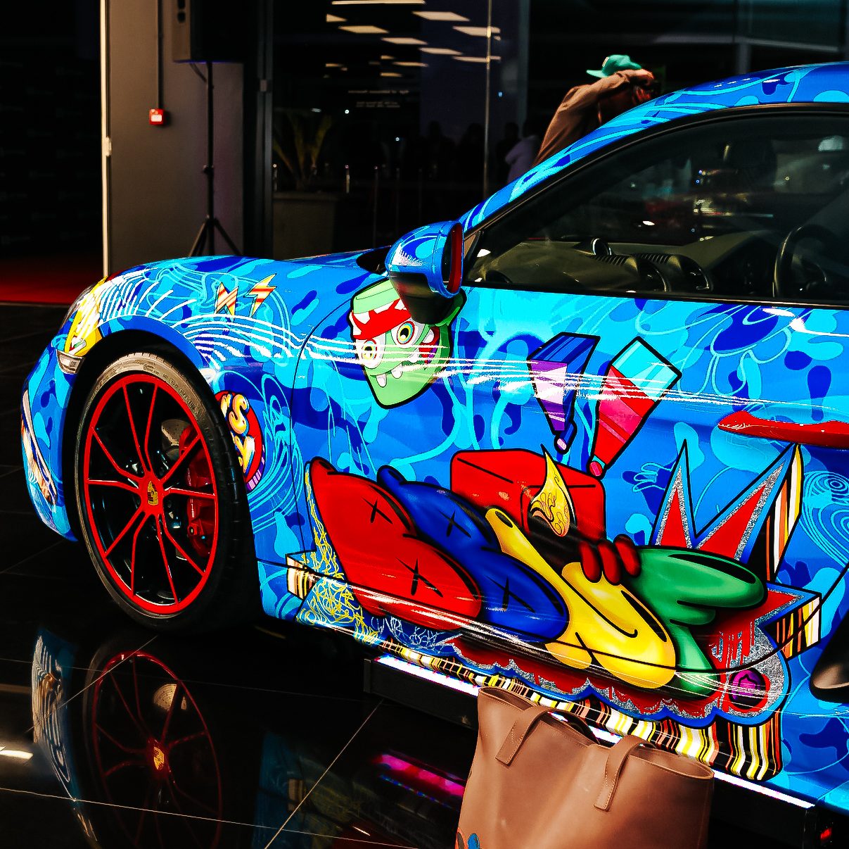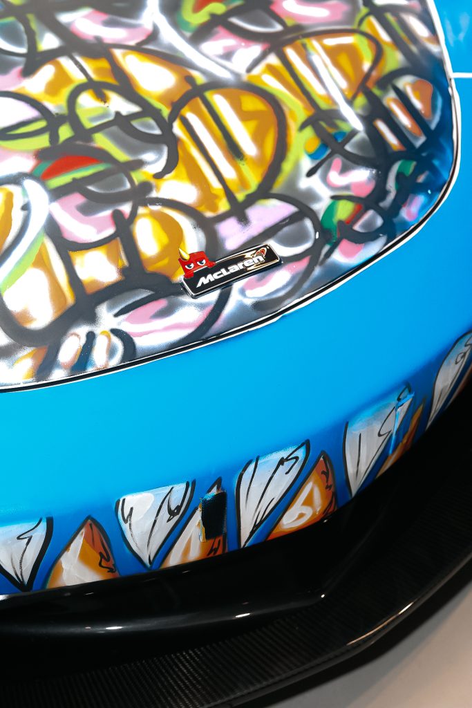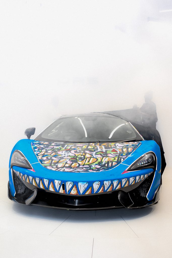 What I had to work on first, was the camo design for the Porsche that was a digital process. I made the design on my computer using software like Photoshop,  Illustrator, and After Effects. This was done in collaboration with M-Town Customs. I put together the design and sent it through to them and they did their magic in a pretty short window of time. So, a big shout out to M-Town. Once I saw the McLaren for the first time, I basically got to work immediately, because I mean I didn’t have much time, so the car was already wrapped white on most of the body panels, white being the areas that I could paint on. Everything else, I had to protect before I could start painting, so that meant I had to mask the car using masking tape and drop sheets. The masking process was very long because, I mean, a  McLaren is not a regular car. It’s a beautifully sculpted, complex design so just trying to figure out all the types of ways I had to mask the supercar took a while, about 36 hours of work, just protecting it. I started painting immediately after the masking process and that was another two days of work so all in all you could say working on the McLaren took four days, up to the last hour. The design on the McLaren was something I had fun with, in the moment and turned out pretty great. I’m very proud of how things came out.